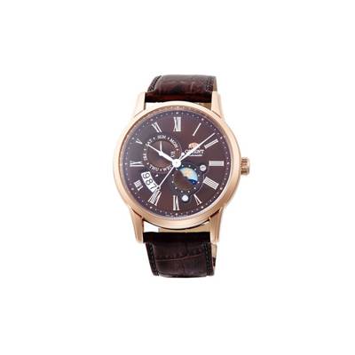 - • classic orient mechanical watch with rose gold stainless steel case and crocodile textured band.