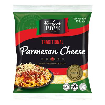 Perfect Italiano Parmesan Grated is the iconic Italian cheese for whipping up Italian cuisine. Bold and richly flavoured, a sprinkle of parmesan grated adds a perfectly savoury touch to your dishes. It's guaranteed to add the richest flavours. Perfect for adding delectable richness to your pasta and salad and is pre-grated from the block for convenience, and packaged in a re-sealable bag for easy storage.