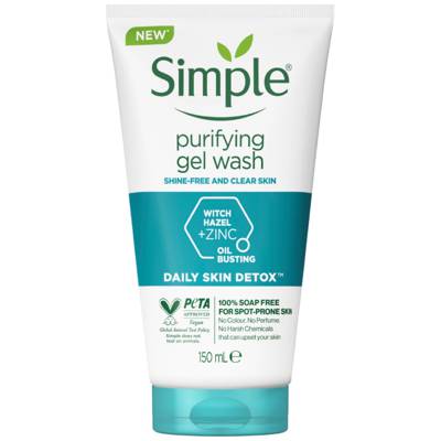 Visibly clear, fresh and shine-free skin is just one wash away, thanks to Simple Daily Skin Detox Purifying Gel Facial Wash. Supercharged with a vitamin-rich formula this is the same gentle care you know and love from Simple for healthy-looking, smooth and clear skin. 5% witch hazel together with zinc boosts this deep cleansing foaming gel with detoxifying and oil-busting properties.