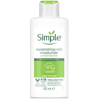 Simple Kind to Skin Replenishing Rich Moisturiser instantly doubles your skin's hydration. It works for up to 24 hours, leaving your skin feeling silky and nourished all day.
