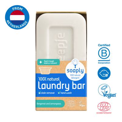 This 100% naturally made laundry bar is the most effective stain remover and a handwash detergent in one! Rub that stubborn stain with the laundry bar and clean with water or trow in your washing machine. Teach tough stains a lesson! Made with 100% natural ingredients 0% plastic With a fresh scent of Bergamot and Lemongrass Ecocert and Vegan Society certified